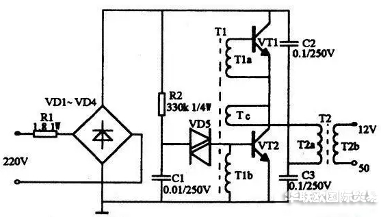如圖所示。DAYKIN變壓器原理與開關電源工作原理相似,二極管vd1~vd4構成整流橋把市電變成 直流電,由振蕩變壓器t1,三極管vt1、vt2組成的高頻振蕩電路,將脈動直流變成高頻電流,然后由鐵氧體輸出變壓器t2對高頻高壓脈沖降壓,獲得所需 的電壓和功率。r1為限流電阻。電阻r2、電容c1和雙向觸發二極管vd5構成啟動觸發電路。 三極管vt1、vt2選用s13005,其b為 15~2 0倍。也可用c3093等buceo>=35ov的大功率三極管。觸發二極管vd5選用32v左右的db3或vr60。振蕩變壓器可自 制,用音頻線繞制在 h7 x 10 x 6的磁環上。tia、t1b繞3匝,tc繞1匝。鐵氧體輸出變壓器t2也需自制,磁心選用邊長27mm、寬 20mm、厚10mm的ei型鐵氧體。t2a用直徑為0.45mm高強度漆包線繞100匝,t2b用直徑為1.25mm高強度漆包線繞8匝。 二極管 vd1~vd4選用 in4007型,雙向觸發二極管選用db3型,電容c1~c3選用聚丙聚酯滌綸電容,耐壓250v。