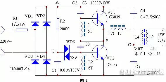 電路正常工作時,A點工作電壓約為215V,B點約為108V,C點約為10V,D點約為25V。如果不振蕩,檢查VT1、VT2及L1、L2、L3的相位是否正常(交換L3的兩根接線即可)。改變L5的匝數可改變輸出電壓。