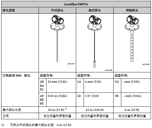 通常,使用桿式探頭或同軸探頭進行液位測量。纜式探頭用于量程超過10 m (33 ft)時的液位測 量(FMP52:量程超過4 m (13 ft)), 以及罐(倉)頂間隙不允許安裝桿式探頭的測量條件下的液位測量。