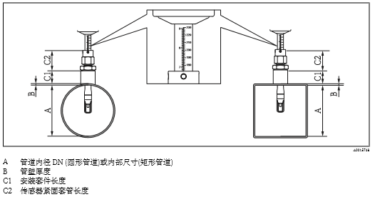 檢查并確認(rèn)管道上的傳感器安裝方向與流向呈 90°。旋轉(zhuǎn)傳感器,使傳感器殼體上的箭頭指向與流 向一致。殼體上的標(biāo)記線用于調(diào)節(jié)插入深度,必須與流向一致。